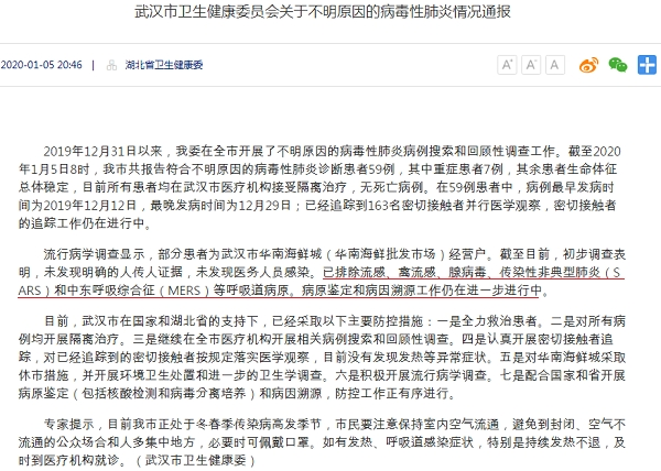 이 웹사이트에 따르면, 5일 오전 8시 현재 원인불명의 바이러스성 폐렴환자는 59명이 보고됐고, 이중 중증 환자는 7명이며, 나머지 환자는 전반적으로 증세가 안정적이다. 59명은 지난 12월 12일부터 29일까지 발병한 환자들이다.