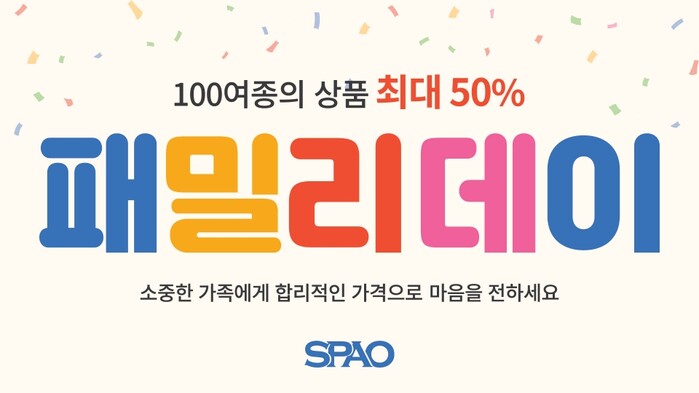 [메가경제= 정창규 기자] 이랜드월드(대표 최운식)가 전개하는 글로벌 SPA 스파오가 온 가족이 함께 즐길 수 있는 ‘패밀리데이’ 프로모션을 진행한다고 29일 밝혔다.