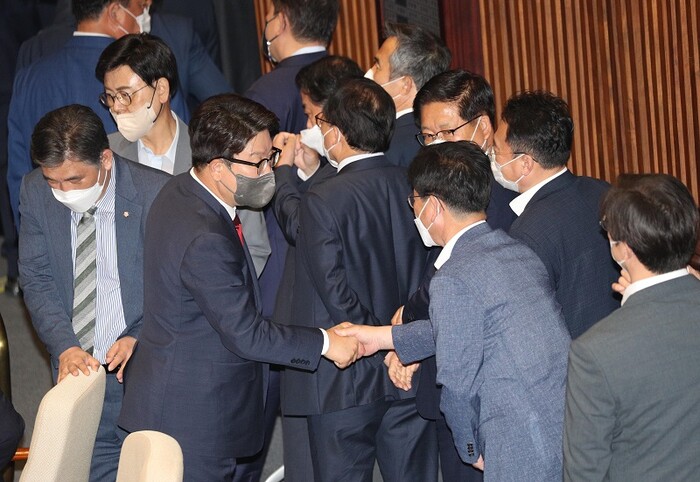 ▲ 국민의힘 권성동 원내대표가 20일 오후 국회 본회의에서 한덕수 국무총리 후보자 임명동의안 표결을 하기 위해 대기하는 의원들에게 감사 인사를 하고 있다. [서울=연합뉴스] |