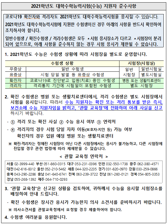 수험생은 확진 또는 격리 사실을 통보받은 즉시 보건소에 수능 지원자임을 밝히고 관할 교육청에 전화해 응시지원에 필요한 사항을 신고해야 한다.