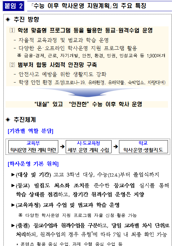 수능 이후 등교·원격수업 활용가능 프로그램 지원 및 '학생안전특별기간' 운영