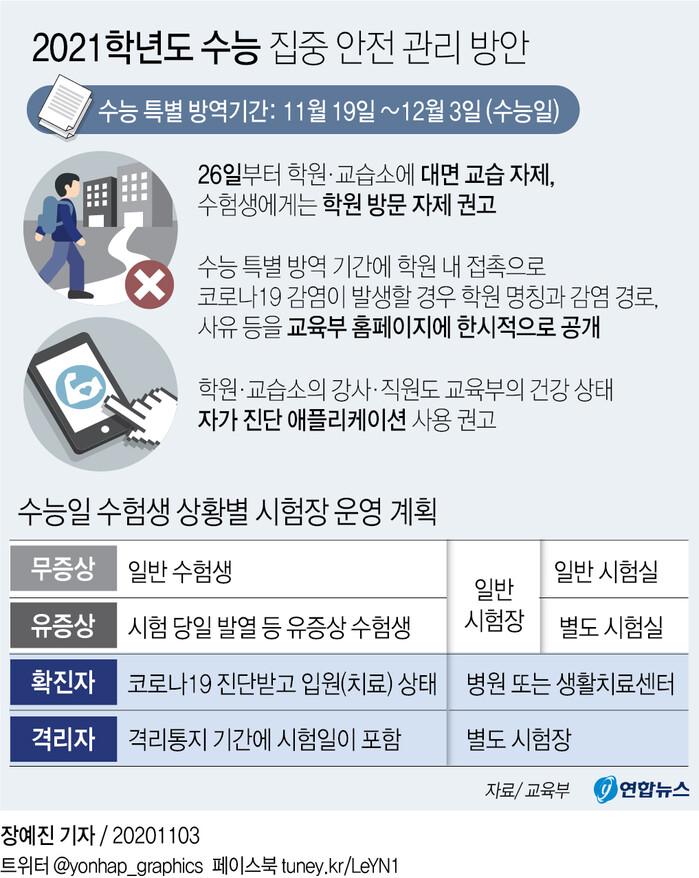 ▲ 정부는 수능 시행 2주 전인 19일부터 시험 당일인 다음 달 3일까지 수능 특별 방역 기간을 운영해 수험생의 감염·격리 위험을 최소화하겠다는 방침이다. [그래픽= 연합뉴스] |