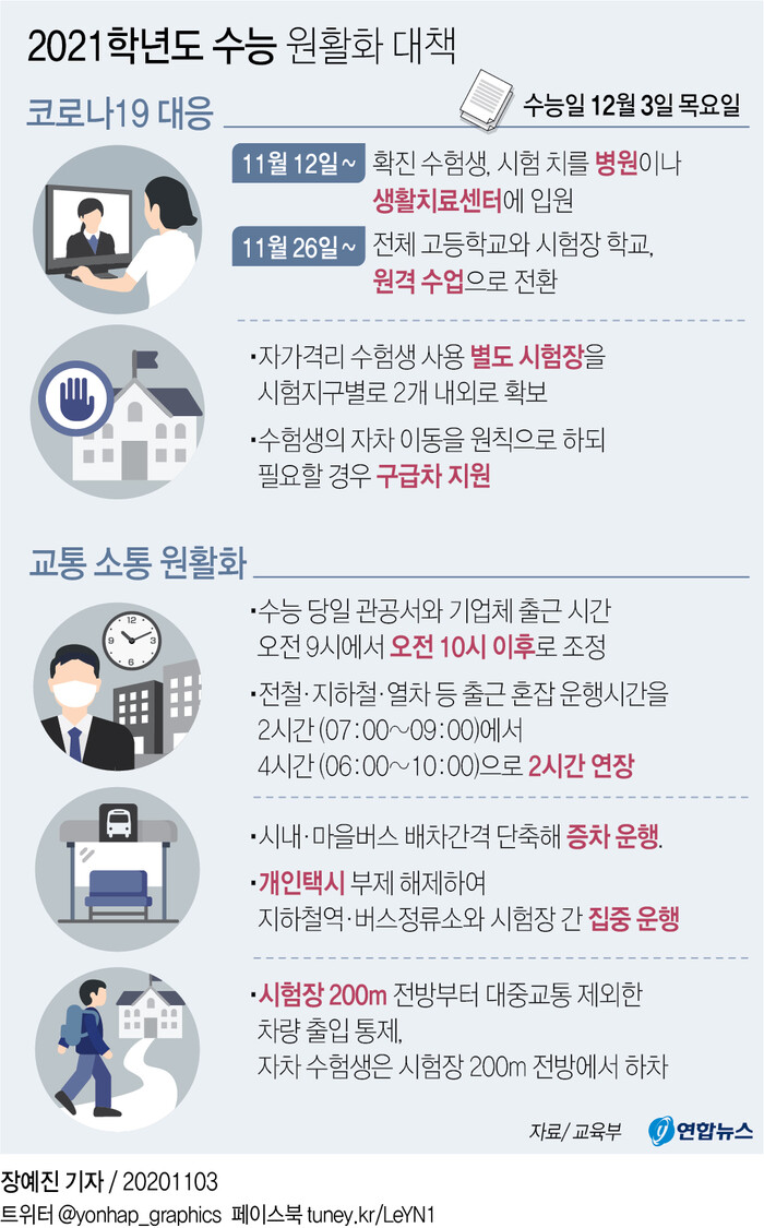 ▲ 교육부가 11월 3일 발표한 '2021학년도 수능 원활화 대책'. [그래픽= 연합뉴스] |