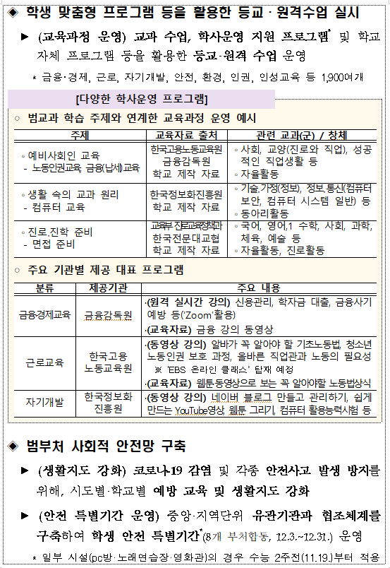 지원계획에는 코로나-19 감염 및 확산 방지를 위해 등교・원격수업 중 활용할 수 있는 다양한 맞춤형 프로그램을 제공하고 학년말 시기의 학생 안전 확보 및 생활지도를 강화하는 등의 방안이 담겼다.