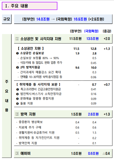 여야는 국회 심의과정에서 정부안보다 3조3천억 원을 증액해 16조9천억원을 확정했다. 2차 방역지원금은 10조원으로 4천억원을, 소상공인 손실보상은 2조8천억원으로 9천억원을, 방역 지원은 2조8천억원으로 1조3천억원을 각각 정부안보다 늘렸다.