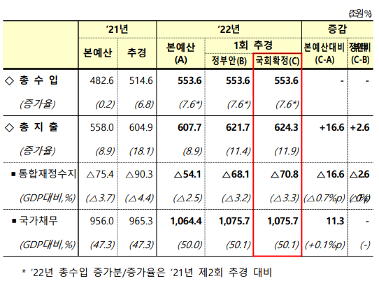 이번에 증액된 추경안은 국민부담 최소화 및 국채시장·국가신용등급 영향 등을 고려해, 국채 추가발행 없이 예비비 조정과 총세입·총세출 마감에 따라 확정된 특별회계 세계잉여금 및 기금 여유자금(2.9조원)을 활용해 충당키로 했다.