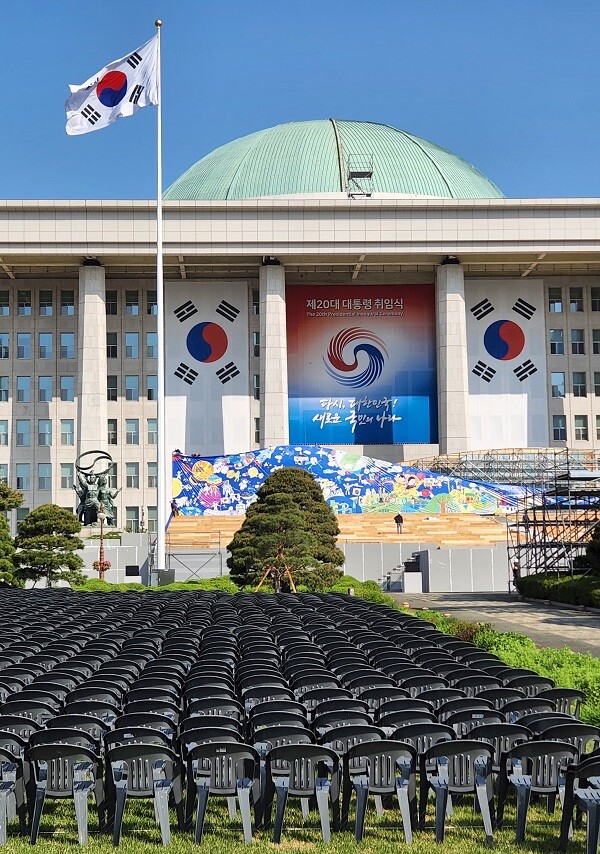 | ▲ 제20대 대통령취임식을 6일 앞둔 4일 국회 본청 앞에서 관계자들이 취임식 무대 단상에 대형 걸개그림을 걸고 있다. [국회사진기자단=연합뉴스] |