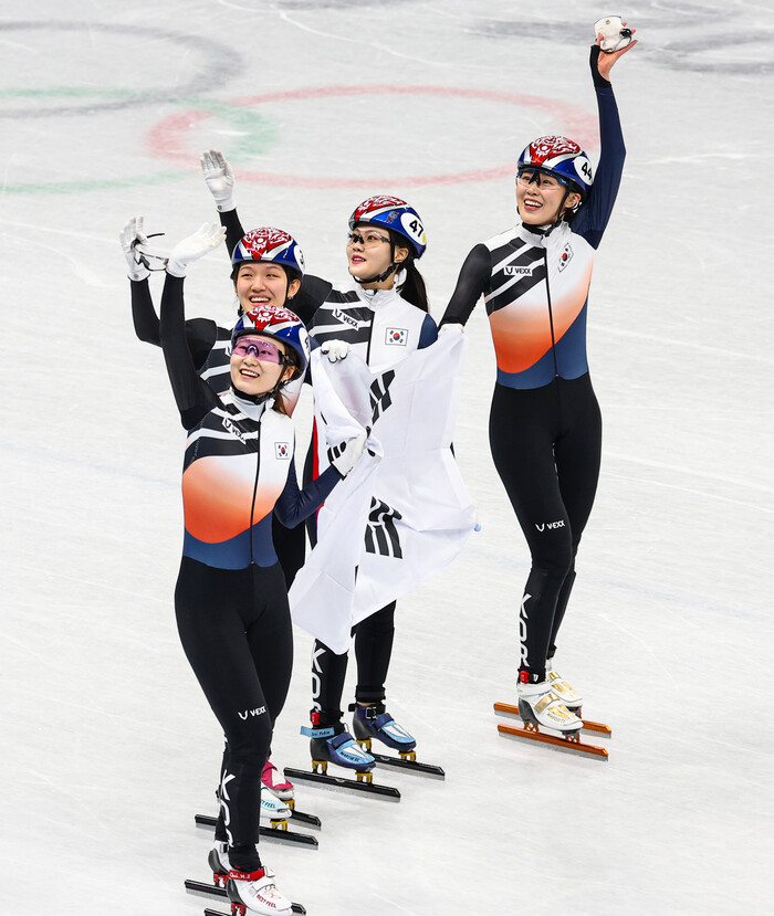 | ▲ 13일 오후 중국 베이징 캐피털 실내 경기장에서 열린 2022 베이징 동계올림픽 쇼트트랙 여자계주 3000m 결승전에서 은메달을 획득한 한국 쇼트트랙 대표팀이 태극기를 들고 기뻐하고 있다. [베이징=연합뉴스] |