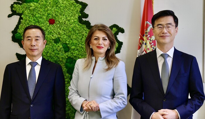| ▲ 지난달 19일 세르비아 베오그라드의 통상·관광·통신부 회의실에서 정원정 기아 유럽권역본부장(사진 왼쪽부터)이 타짜나 마티치(Tatjana Matić) 세르비아 통상·관광 ·통신부 장관과 이재웅 주세르비아 대한민국 대사와 함께 부산세계박람회 유치 관련 면담을 가진 후 기념사진을 촬영하고 있는 모습 [사진=현대차그룹 제공] |