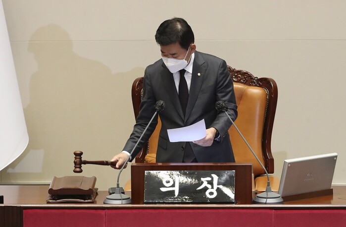 | ▲ 김진표 국회의장이 29일 국회에서 열린 본회의에서 박진 외교부 장관에 대한 해임건의안이 가결됐음을 선포하고 있다. [국회사진기자단=연합뉴스] |