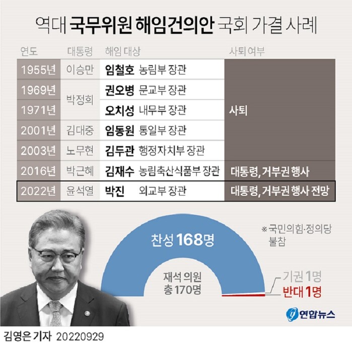| ▲ 역대 국무위원 해임건의안 국회 가결 사례. [그래픽=연합뉴스] |