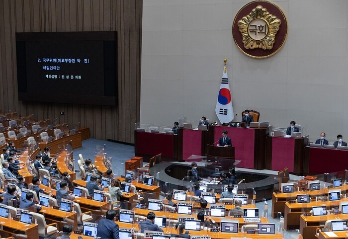 민주당이 당론으로 발의한 박진 외교부 장관 해임건의안이 야당 단독 처리로 국회 본회의를 통과했다.