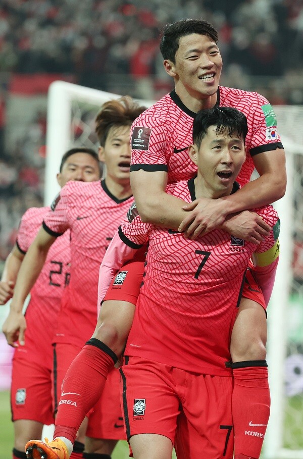 | ▲ 24일 서울 마포구 서울월드컵경기장에서 열린 국제축구연맹(FIFA) 2022 카타르 월드컵 아시아 지역 최종예선 A조 9차전 대한민국과 이란의 경기. 한국 손흥민이 선취골을 터트린 뒤 황희찬을 업고 환호하고 있다. [서울=연합뉴스] |