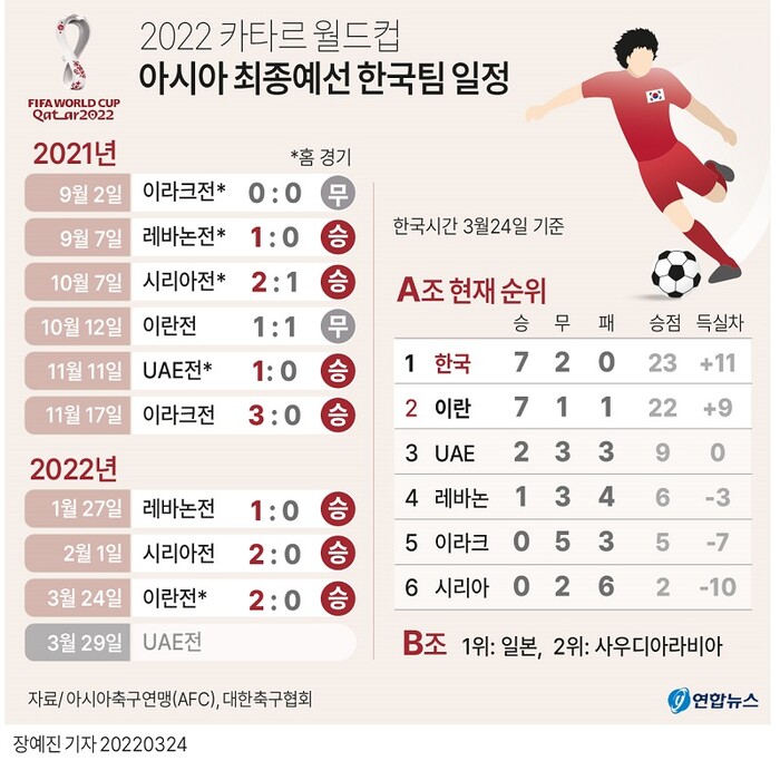 | ▲ 2022 카타르 월드컵 아시아 최종예선 한국팀 일정. [그래픽=연합뉴스] |