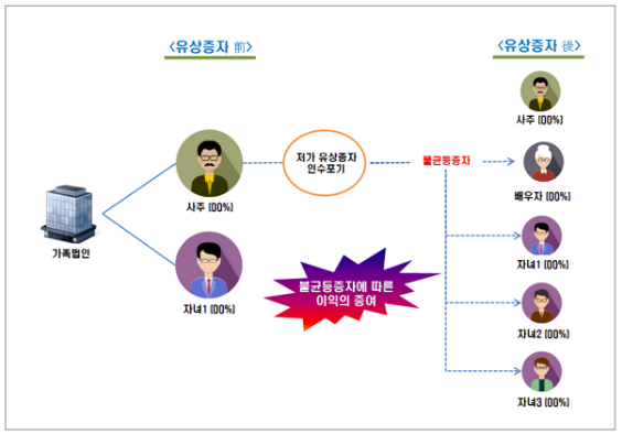 ▲ 시가보다 낮은 가액으로 유상증자를 실시하면서 인수포기한 지분을 자녀등에게 재배정하여 증여한 혐의. [국세청 제공] |