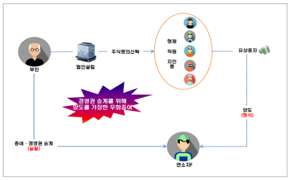 ▲ 사주가 친인척·지인등을 통해 명의신탁한 주식을 양도로 가장하여 연소자 자녀에게 변칙증여하고 세금 탈루의 사례. [국세청 제공] |