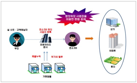 ▲ 실제 사주인 부친이 자녀 명의로 프랜차이즈 사업을 운영하여 모든 재산을 편법 이전한 사례. [국세청 제공] |