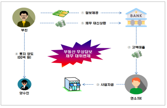 ▲ 자녀가 부친의 부동산을 담보로 제공하고 금전을 차입하여 사업상 목적으로 무상 사용하고, 부친이 해당 부동산을 양도하면서 자녀의채무를 대신 변제한 혐의의 사례. [국세청 제공] |