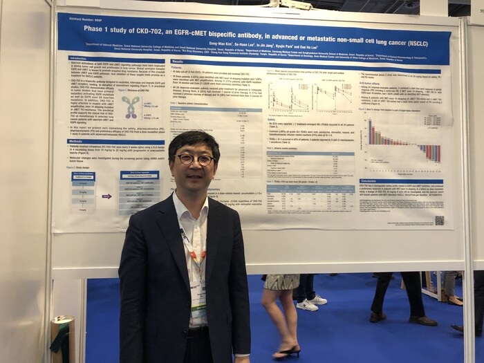 | ▲ 종근당은 지난 9일부터 13일까지 프랑스 파리에서 열린 ‘2022 유럽종양학회’ 연례학술대회에서 바이오신약 ‘CKD-702’의 임상 1상 결과를 포스터로 발표했다. 이번 대회에서 연구 결과를 발표한 서울대학교병원 종양내과 김동완 교수 [사진=종근당 제공] |
