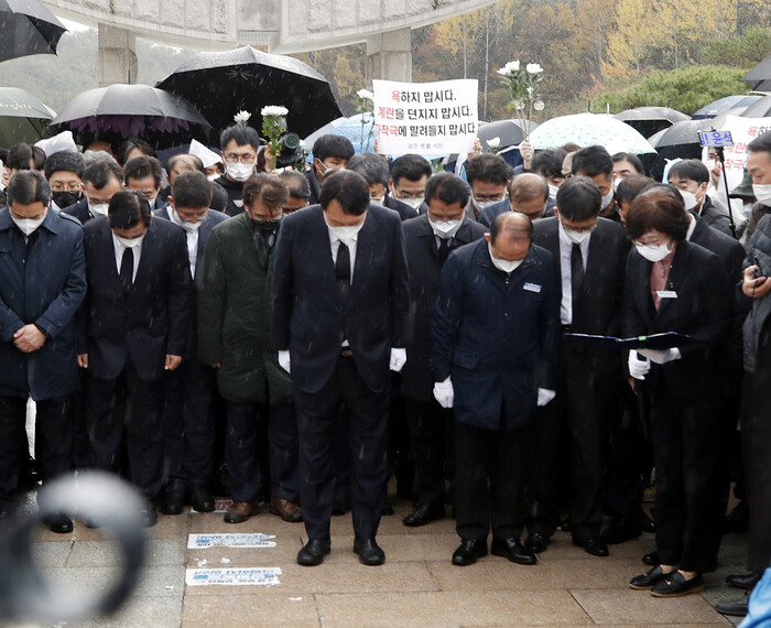 ▲ 국민의힘 윤석열 대선후보가 5·18 민주묘지 추모탑에 헌화·분향하려 했으나 반대하는 시민들에 가로막혀 추모탑 입구에서 묵념으로 참배를 대신했다. [광주=공동취재/연합뉴스] |