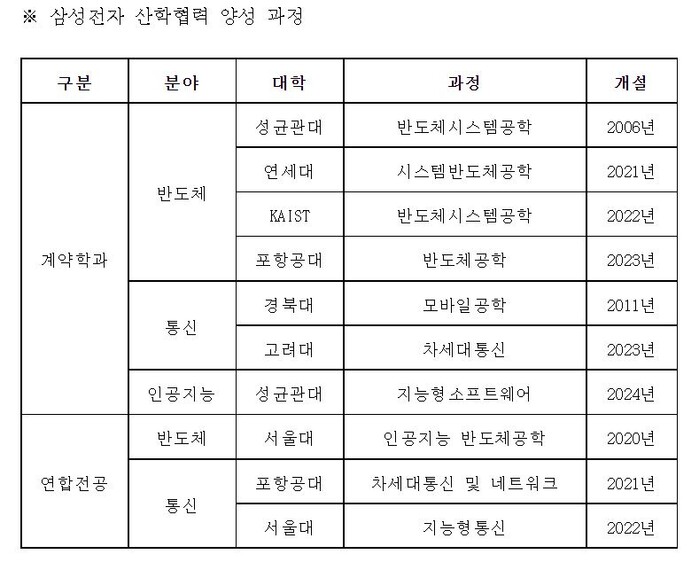 삼성전자는 이번 성균관대 지능형소프트웨어 계약학과 설립을 포함해 AI, 차세대 통신, 반도체 분야에서 국내 7개 대학과 협력해 총 10개의 계약학과·연합전공을 지원한다.
