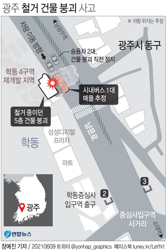 연합뉴스에 따르면, 9일 오후 4시 22분께 광주 동구 학동에서 철거 공사 중인 5층 건물이 통째로 붕괴되며 인근 버스정류장에 막 정차한 운림54번 시내버스가 건물 잔해에 매몰됐다.