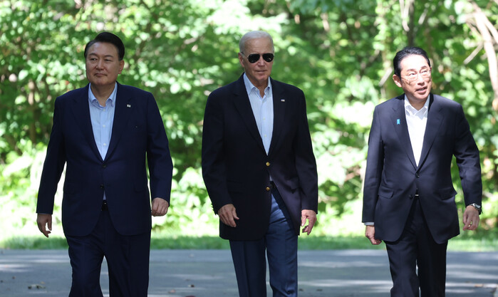 | ▲ 윤석열 대통령과 조 바이든 미국 대통령, 기시다 후미오 일본 총리가 18일(현지시간) 워싱턴DC 인근 미국 대통령 별장인 캠프 데이비드에서 열린 한미일 정상 공동기자회견에 입장하고 있다. [캠프 데이비드=연합뉴스] |