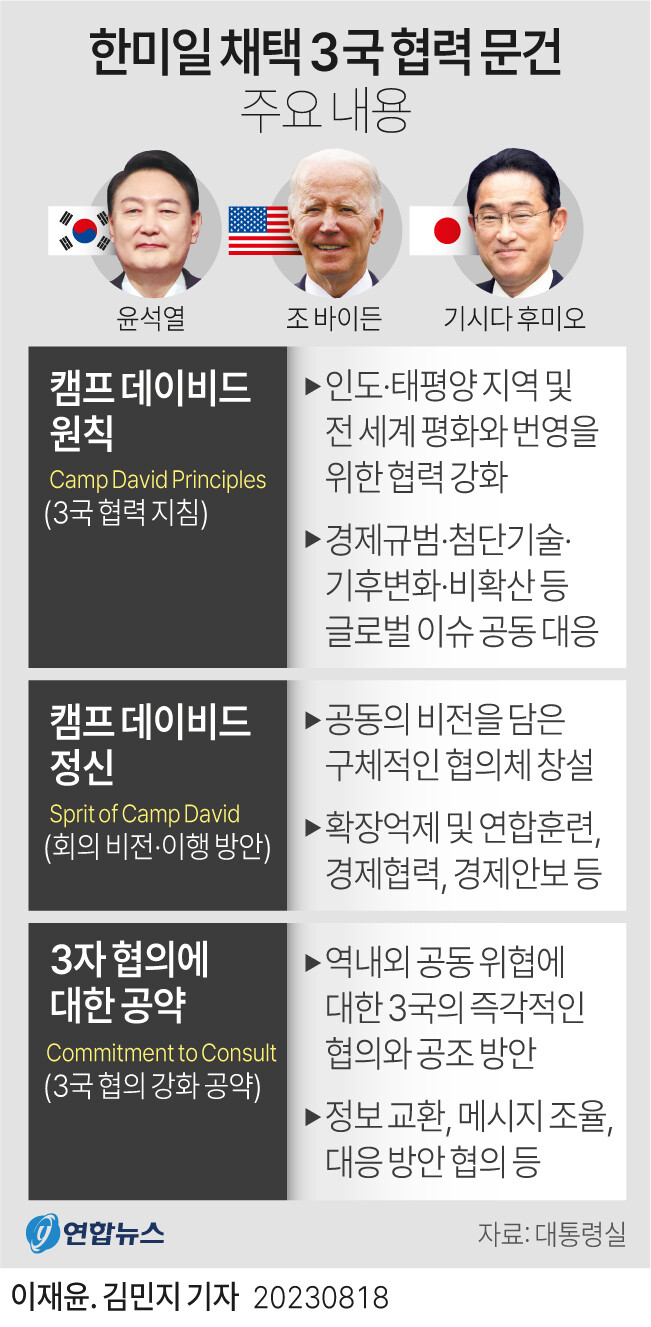 윤석열 대통령과 조 바이든 미국 대통령, 기시다 후미오 일본 총리는 지난 18일(현지시간) 미국 워싱턴 인근 대통령 별장인 캠프데이비드에서 열린 정상회의에서 한미일 협력의 지속력 있는 지침이 될 ‘캠프 데이비드 원칙’, 3국의 공동 위협에 대한 공조 방안을 담은 '한미일 간 협의에 대한 공약', 한미일 3국 협력의 비전과 그 이행 방안을 담은 ‘캠프 데이비드 정신: 한미일 정상회의 공동성명’ 등 3건의 문서를 채택했다.