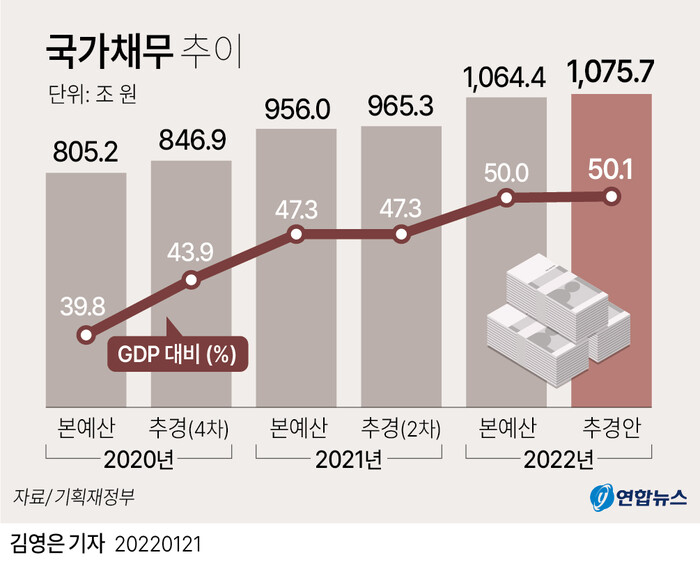 ▲ 14조원 규모의 추경안으로 국가채무는 1075조7천억원까지 늘어나 국내총생산(GDP) 대비 국가채무비율이 50.1%가 된다. [그래픽=연합뉴스] |