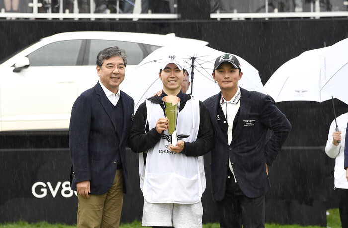 | ▲ (왼쪽부터) 제네시스 장재훈 사장, 김재민 캐디, ‘2022 제네시스 챔피언십’ 우승자 김영수 선수 [사진=현대차그룹 제공] |