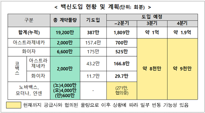 6월 말까지 이미 확정된 1809만 회분으로 1200만 명에 대한 1차 접종이 가능하며 2차 접종시기가 도래하는 분에 대한 2차 접종도 가능하다는 설명이다.