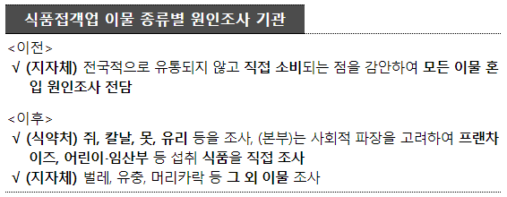 지금까지는 전국적으로 유통되지 않고 직접 소비되는 점을 감안해 모든 이물 혼입 원인조사를 지자체가 전담했다. 하지만 앞으로는 식약처가 쥐, 칼날, 못, 유리 등을 조사하고 본부는 사회적 파장을 고려해 프랜차이즈, 어린이‧임산부 등 섭취 식품을 직접 조사하기로 했다는 것.