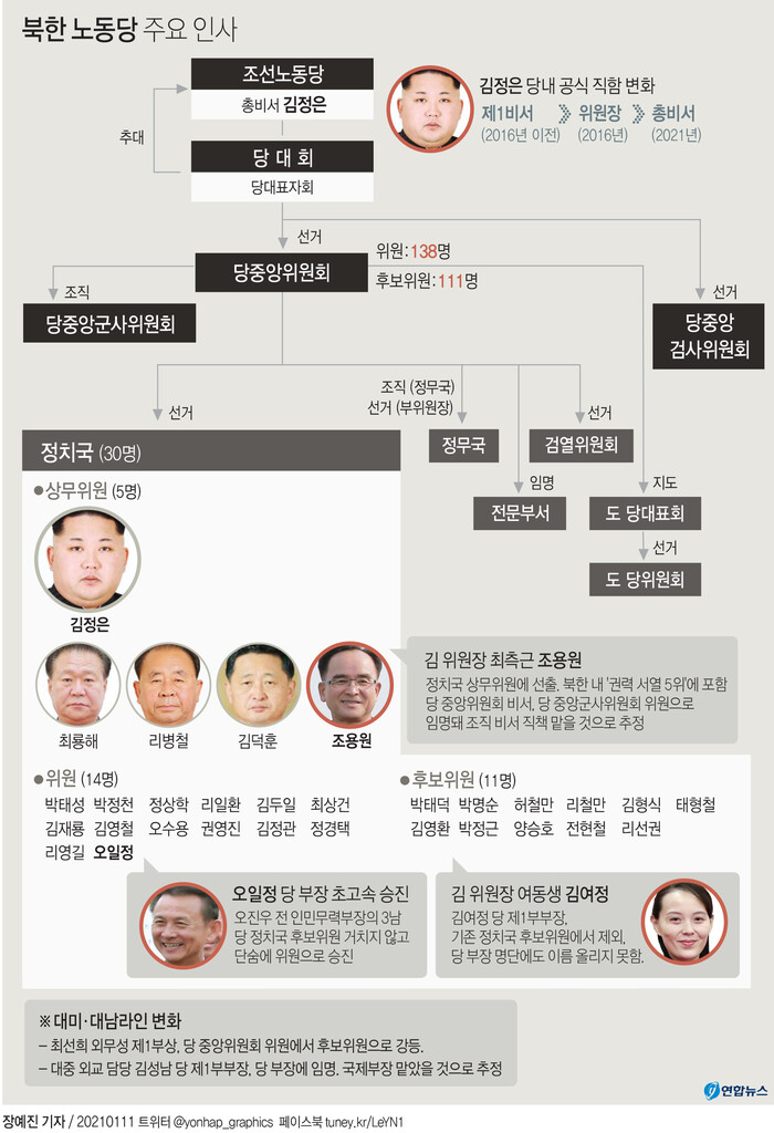 반면 이번 인사에서 '김정은의 입' 역할을 맡아 승진 여부가 주목됐던 김 위원장의 여동생인 김여정 당 제1부부장은 기존 정치국 후보위원에서도 빠졌고, 당 부장 명단에도 이름을 올리지 못해 눈길을 끈다.