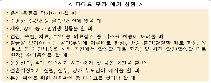 또한, 세면, 음식섭취, 의료행위, 수영장·목욕탕 등 물속·탕 안에 있을 때, 공연 등 얼굴이 보여야 하는 불가피한 상황 등에서는 과태료 부과의 예외가 적용된다.