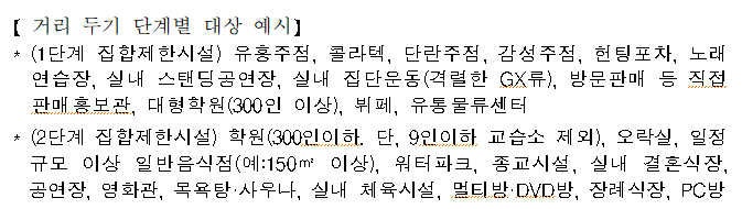 예를 들어 사회적 거리두기 1단계에서는 유흥주점 등의 12개 시설이 대상이 되며, 2단계에서는 300인 이하 학원 등에 대해 추가로 적용된다.