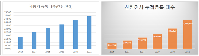 ▲ 자동차등록대수와 친환경차 누적등록대수. [국토교통부 제공] |