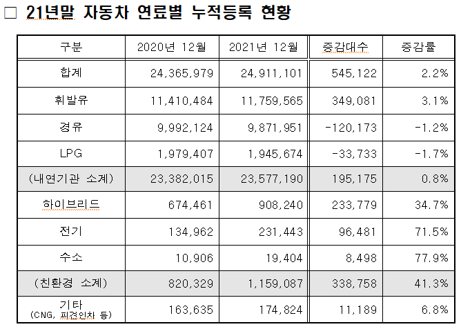 ▲ 2021년말 자동차 연료별 누적등록 현황. [국토교통부 제공] |