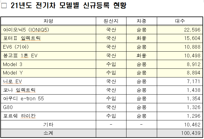 ▲ 2021년도 전기차 모델별 신규등록 현황. [국토교통부 제공] |