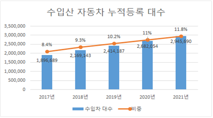 수입차 점유율은 꾸준히 오르고 있다. 2017년 8.4%에서 2019년 10.2%로 처음 10%대에 진입한 뒤 2020년엔 11.0%, 2021년엔 11.8%로 점점 더 비중을 키웠다.