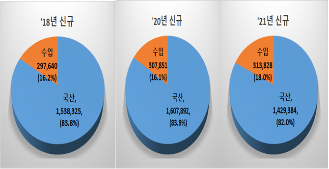 ▲ 2018년, 2020년, 2021년 신규 등록의 국산차와 수입차 비율. [국토교통부 제공] |