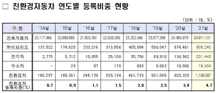 친환경차 등록비중은 2014년 말 0.7%에서 2020년말 3.4%, 2021년말 4.7%로 꾸준히 높아지고 있다.