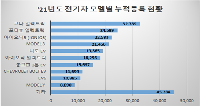 ▲ 2021년도 전기차 모델별 누적등록 현황. [국토교통부 제공] |