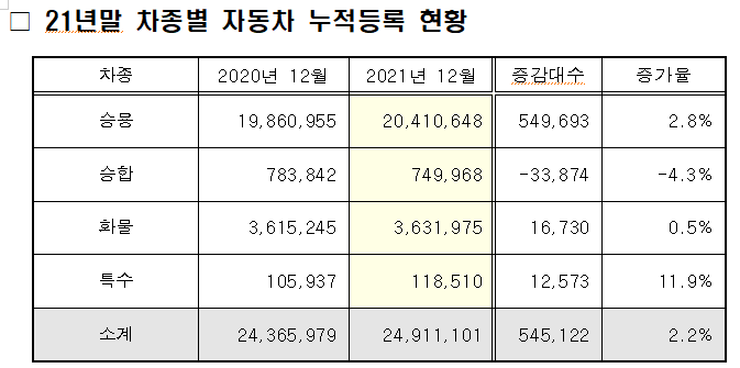 ▲ 2021년말 차종별 자동차 누적등록 현황. [국토교통부 제공] |