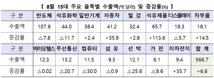 ▲ 8월 15대 주요 품목별 수출액 및 증감률. [산업부 제공] |