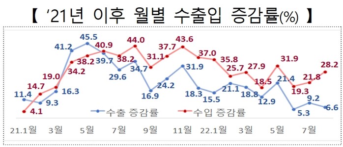 ▲ 21년 이후 월별 수출입 증감률. [산업부 제공] |