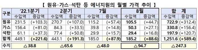3대 에너지원 가격 모두 전년보다 높은 수준을 유지하고 있는 가운데, 폭염 등으로 에너지 수요가 확대되면서 수입이 급증했다.
