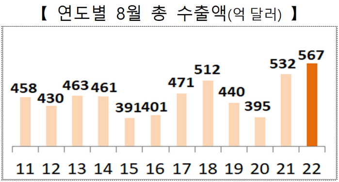 러시아-우크라이나 전쟁 장기화, 주요국의 강력한 통화긴축 정책 등 어려운 여건 속에서도 지난달 수출액은 기존 8월 최고 실적인 지난해 8월(533억 달러) 대비 30억 달러 이상 넘어섰다. 일평균 수출은 23조6억달러로 전년 동월보다 2.2% 증가했다.