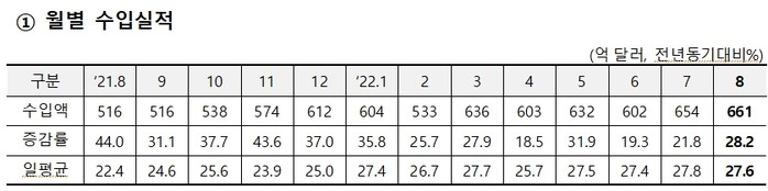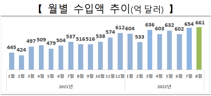 수입액은 지난 3월 이후 6개월 연속 600억달러대를 유지하고 있으며, 에너지·중간재 수입 급증 등 영향으로 높은 수준의 수입액을 이었다.