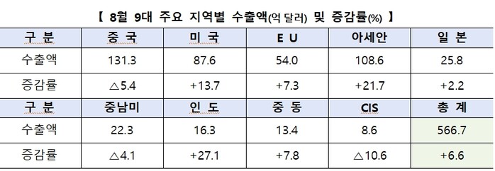 ▲ 8월 9대 주요 지역별 수출액 및 증감률. [산업부 제공] |