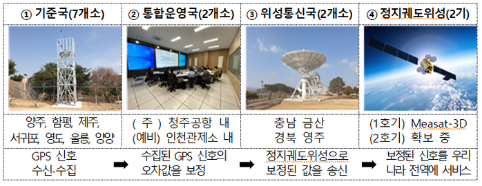 그간 총사업비 1280억원을 연구개발에 투자해 한국항공우주연구원 주관으로 전국에 7개의 기준국, 2개의 위성통신국, 2개의 통합운영국 등 지상 인프라를 구축해 왔다.